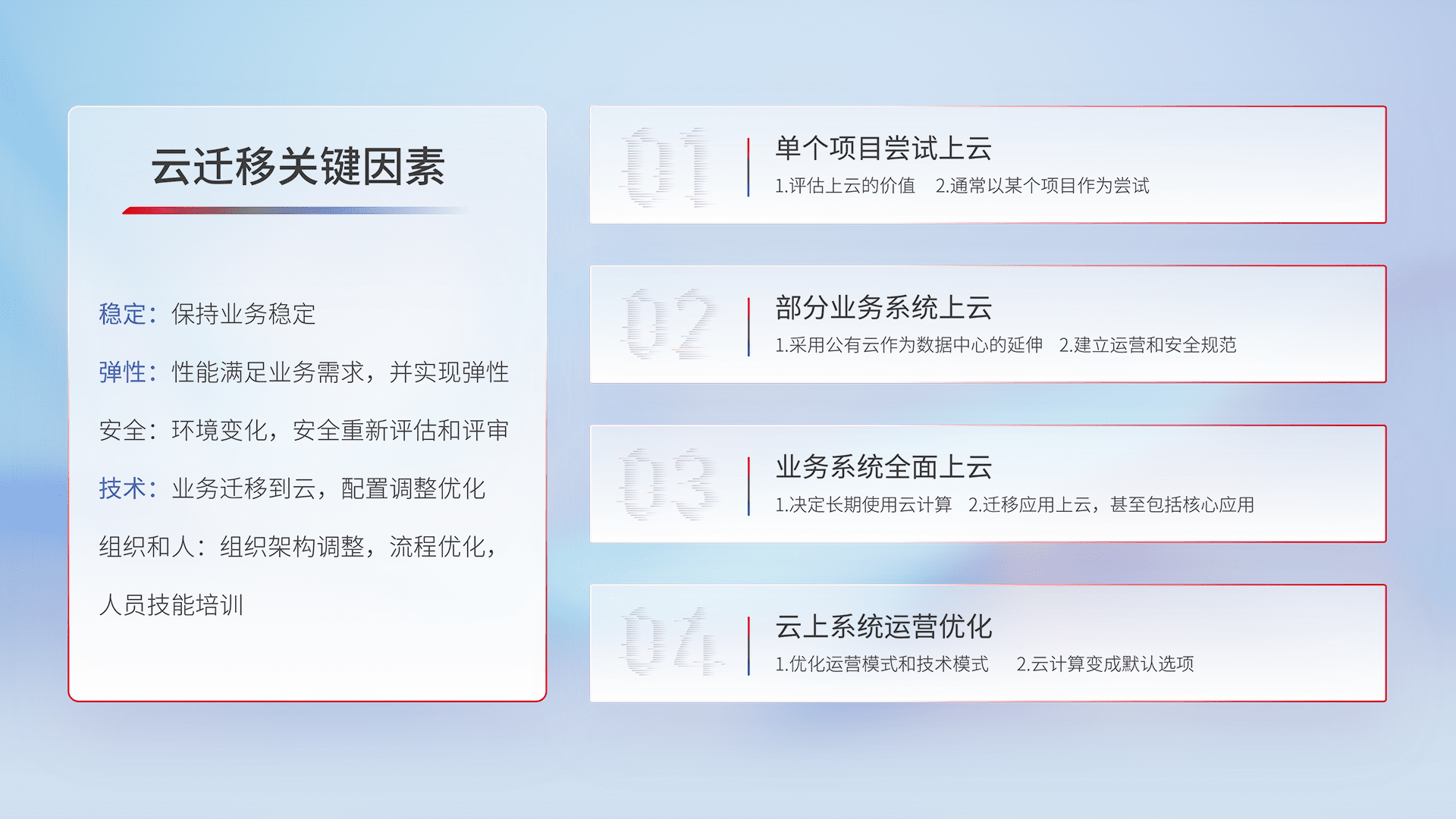 结合实际业务,,,从规划设计、、、云平台选型、、、云原生改造、、数据迁移、、、、集成交付,,,,迁移全过程为客户识别最佳上云路径,,,,做好风险识别管理,,,设计网络架构、、身份权限、、安全审计合规、、、操作审计、、、日志审计、、、监控告警策略、、、多站点容灾设计等,,,,对云上基础设施进行整体规划,,,提升IT治理水平,,,以满足弹性、、、高可用、、、高性能的需求。。。