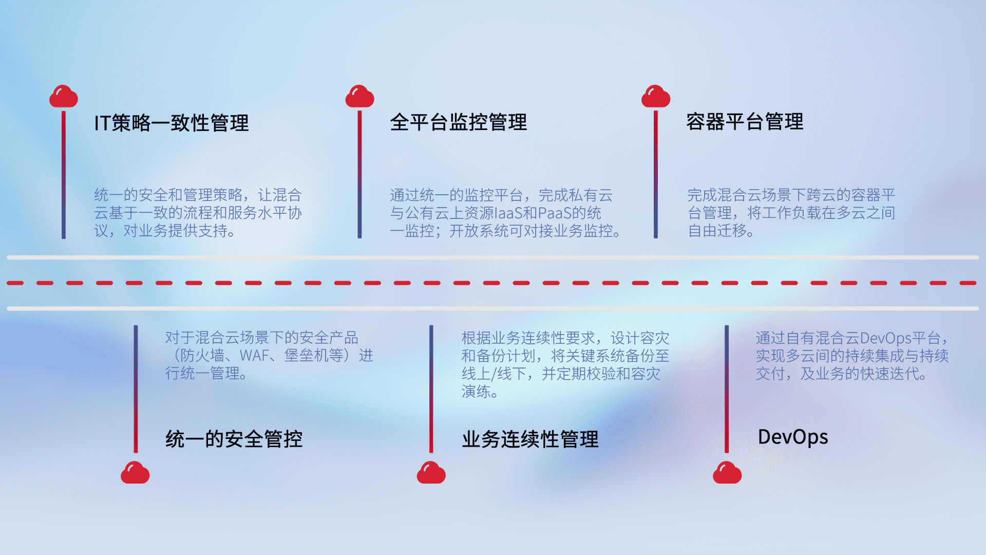 通过多云纳管,,,,以统一的资源数据模型把客户的云资源进行抽象和封装,,,进而实现对多云资源的统一操作,,,保障云资源管理的可靠性、、、稳定性与可用性。。。。量身定制化运维内容,,,,配置、、、开发运维、、补丁管理、、、、备份、、、、监控、、认证和访问管理、、、审计和日常巡检等,,,保障在用云过程中的可靠度,,,,稳定度以及高可用率。。。。