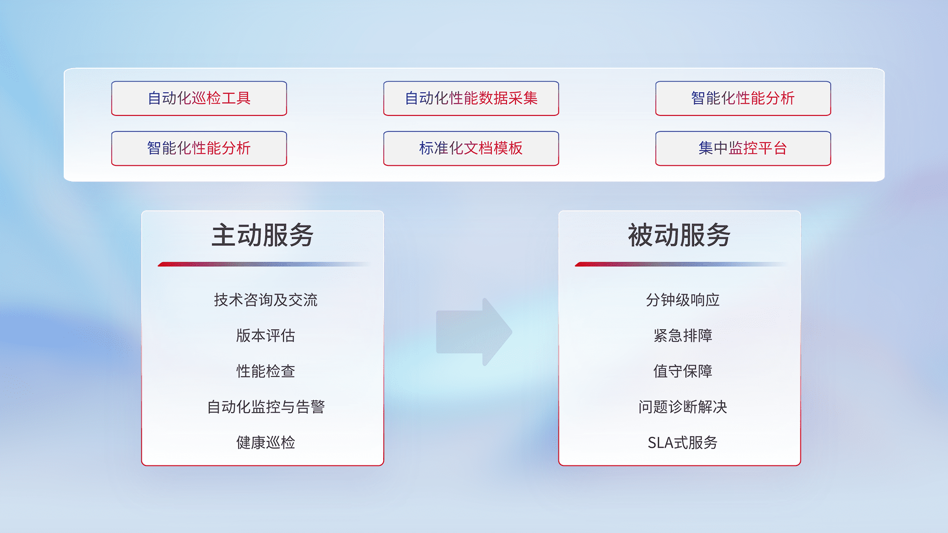 智能化工具和标准化文档,,,,保障服务质量,,,提供主动服务(包含技术咨询、、、版本评估、、、性能检查、、自动化监控与告警、、健康巡检)和被动服务包含(分钟级响应、、、、紧急排障、、、值守保障、、、、问题诊断解决、、、SLA服务)。。。。
