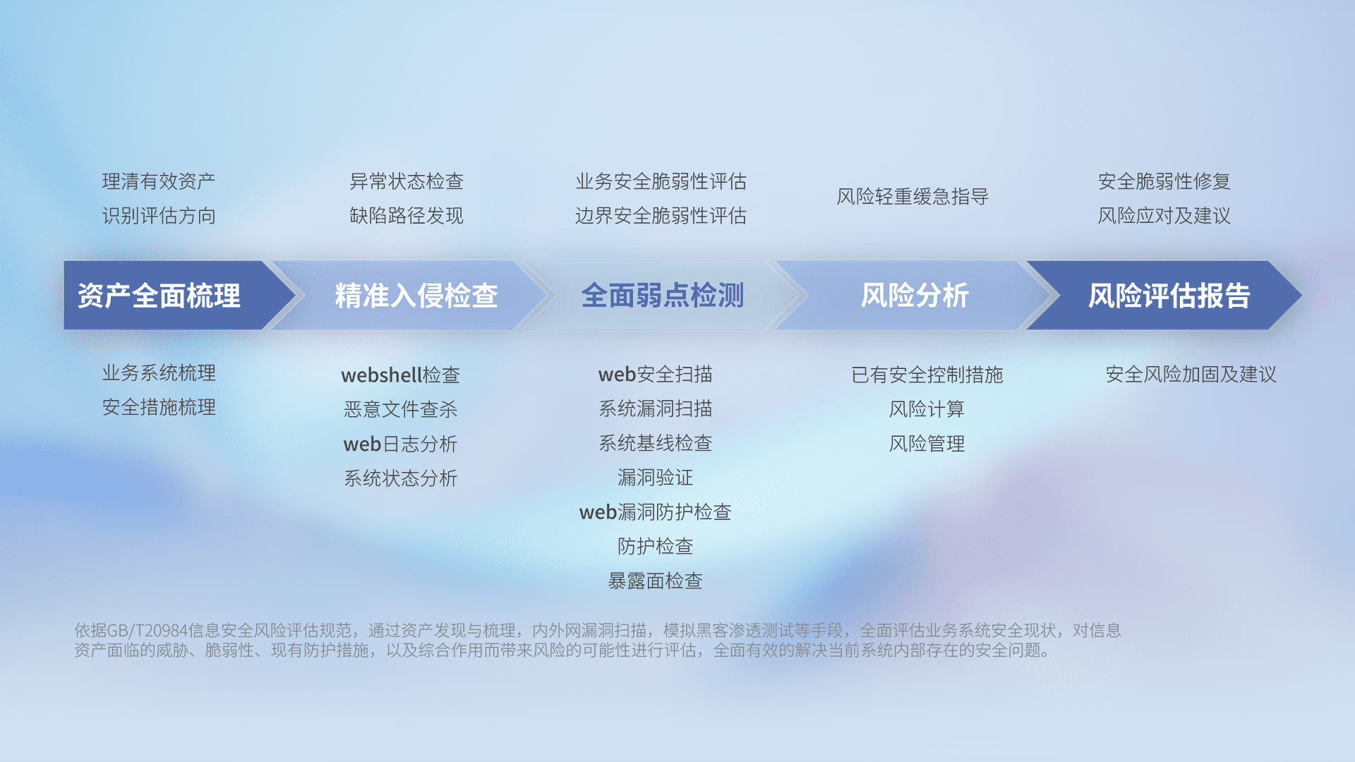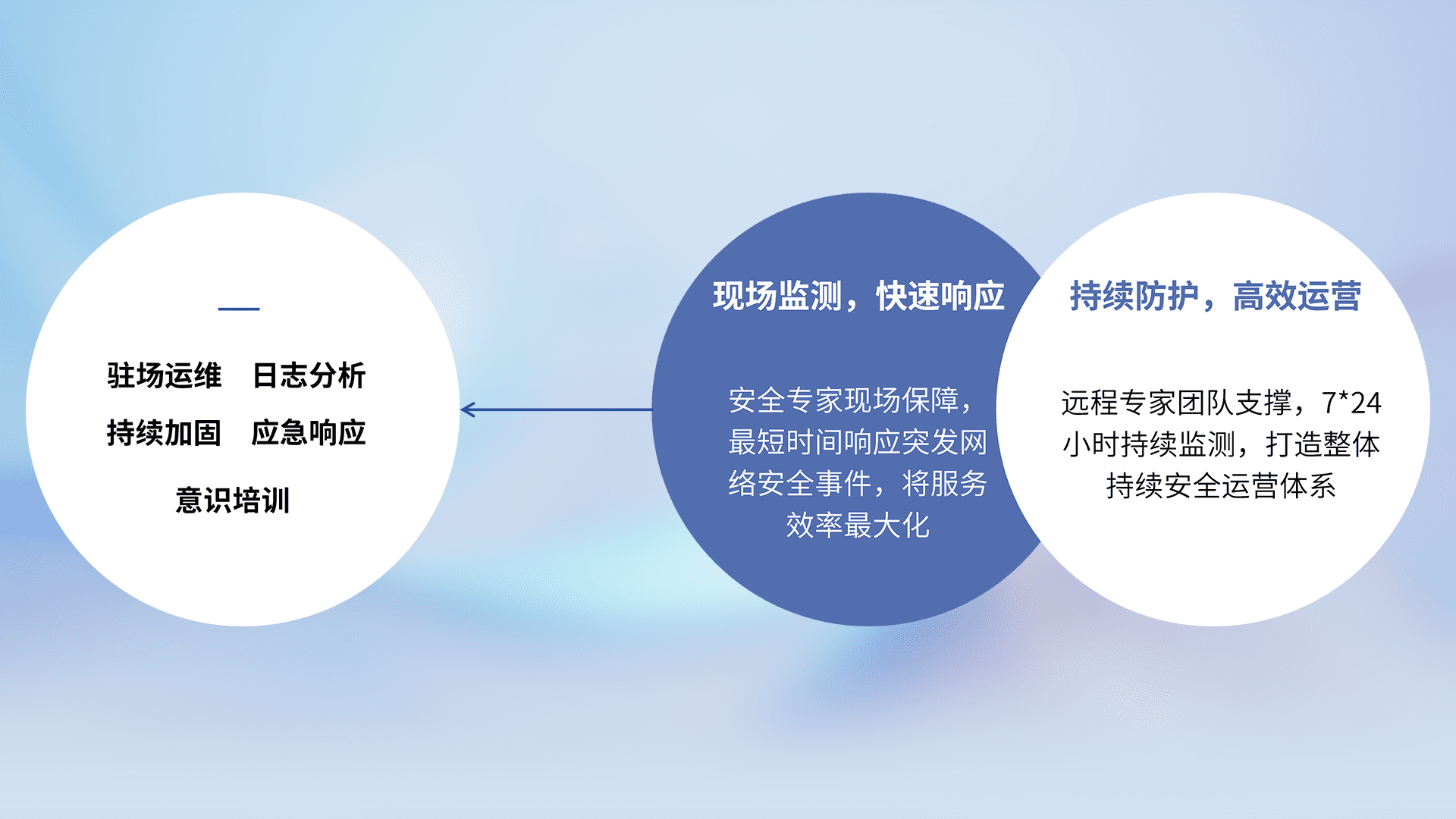 针对客户行业特性,,,,以专业的安全服务+多厂商联合解决方案提供专属的一站式安全管理服务,,帮助客户全面感知网络空间威胁,,,基于识别、、、检测、、、分析、、、、防护、、监测、、响应的服务理论模型,,,从方案咨询、、集成交付、、、、评估验证、、、优化加固、、、运维运营,,,致力于为客户提供完整的闭环管理式安全服务。。。。以实战经验为客户打造高抵御风险的安全体系,,,,帮助客户发现威胁、、、对抗威胁、、、处置威胁,,,不断积累安全对抗能力,,,持续保障数字化安全。。。